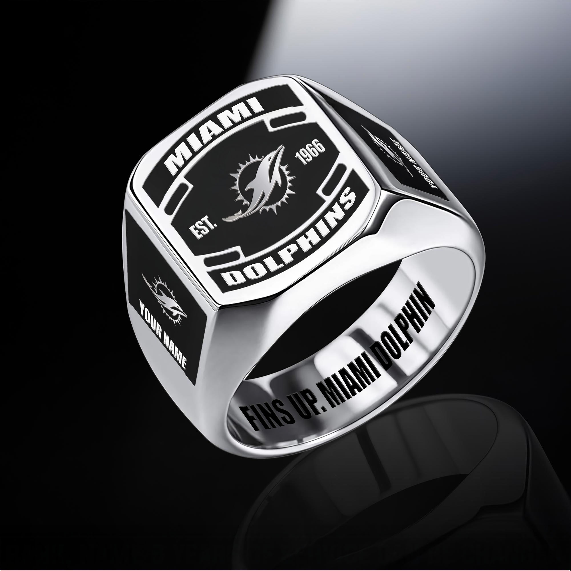 With the launch of the exclusive Made-to-Order service, you can make your Ring unique by not only having your special Miami Dolphins Emblem but also your Name printed on the item. Available in Silver, Gold, or Black, so you can match your personal style while showing off your car pride